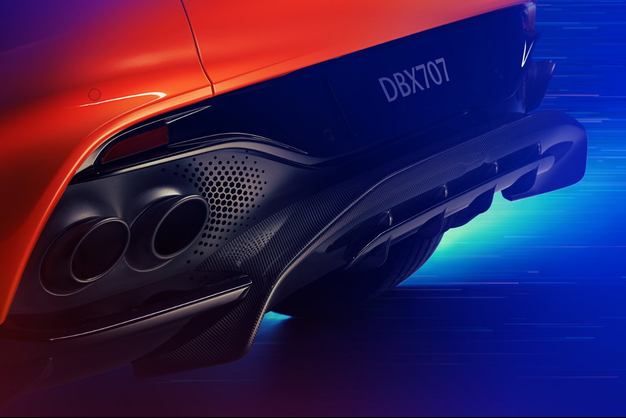 Na zunanjosti je predstavljenih 5 novih barv (Epsilon Black, Helios Yellow, Sprint Green, Malachite Green in Aura Green, kot tudi dodatek Podium Green, izključno na DBX707 AMR23 Edition) in dva zaključka za 23-palčno kolesa (Saten Black za Fortis platišča in Copper Bronze za Forged platišča). Nove so tudi vratne kljuke, ki se izvlečejo, ko avto odklenete, in vzvratna ogledala s steklom, v katerih so vgrajene kamere, ki podpirajo 3D pomoč pri parkiranju.
