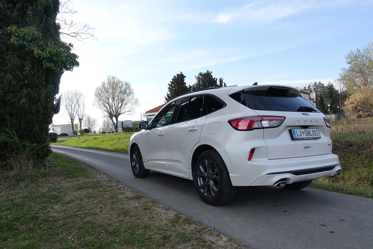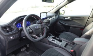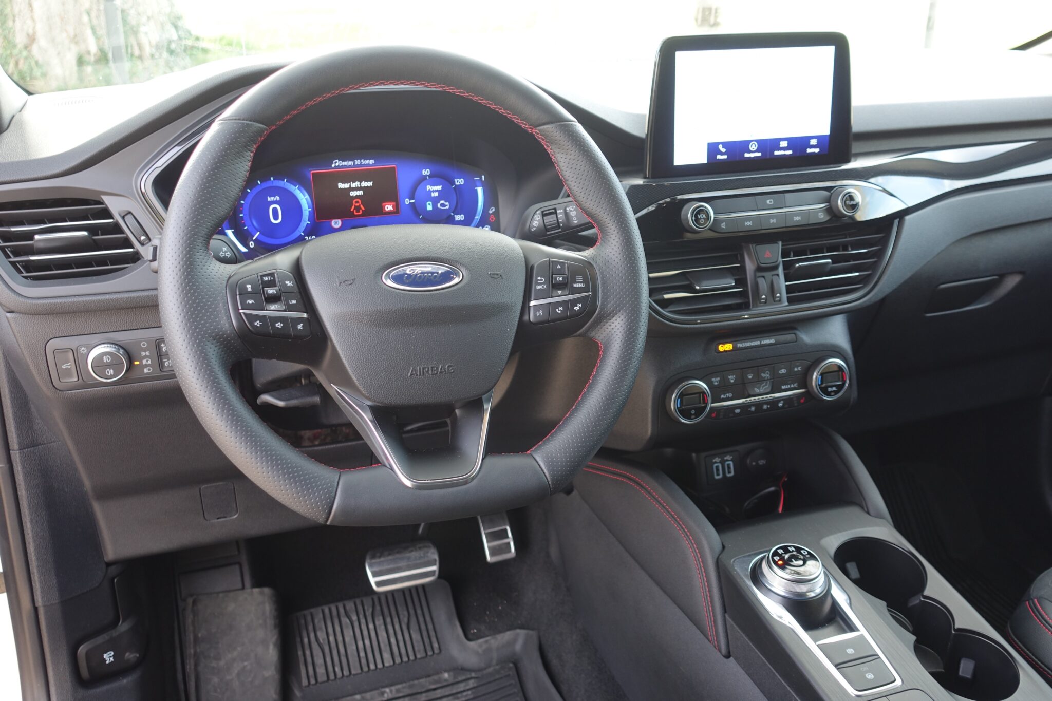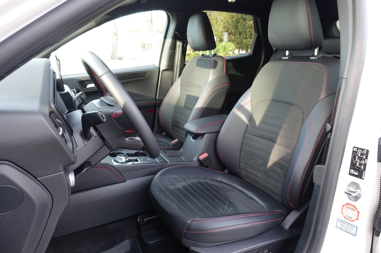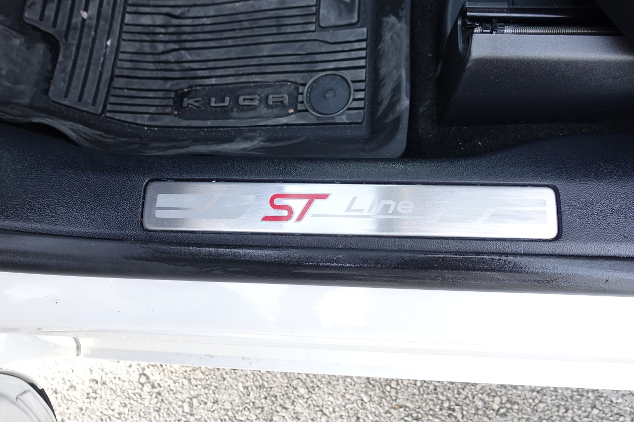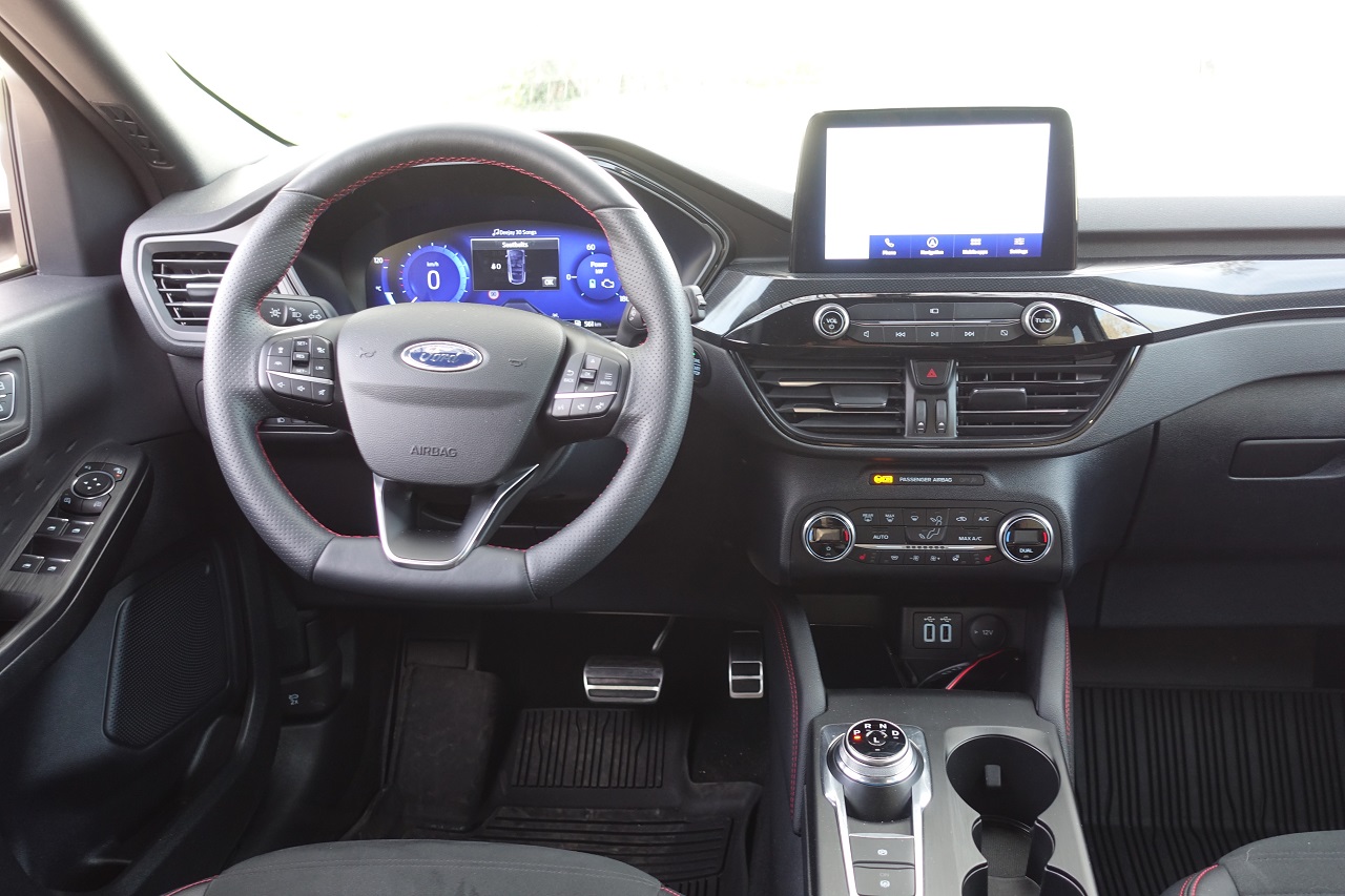 V različici opreme ST-Line z izrazitejšimi odbijači in zadnjim spojlerjem, 18-palčnimi aluminijastimi platišči ter rdečimi šivi na sedežih in vratnih oblogah ustvarja drznejši videz. Malo več športnega duha prispeva unikaten ST-Line volanski obroč z ravnim spodnjim delom ter prednja in zadnja tepiha iz velurja z ST-Line logotipom Kuga. Po prostoru radodarna v notranjosti in v tem primeru tudi v prtljažniku. Litij ionska baterija 1,1 kWh je nameščena pod desnim sedežem. Prtljagi je tako namenjenegado 645 l prostora, kar ni malo celo za družinske potrebe. V notranjost izpostavljamo dober voznikov položaj za volanom, potovalno udobne sedeže iz eko usnja in žameta, prijetnega na otip, udobna zadnja sedeža, obilo informacij na digitalni 12-palčni instrumentni plošči in Head-up displayu na višini voznikovih oči ter na osrednjem 8-palčnem zaslonu na dotik. Povezljivost in nadzor nad telefonom, glasbo in navigacijskim sistemom tudi z glasovnimi ukazi omogoča sistem Ford Sync 3. Barvni zaslon občutljiv na dotik lahko upravljamo s potezami prstov in gibi, gumbi za upravljanje navigacije so nekoliko prenizko za intuitivno navigacijo, ker jemljejo pogled s ceste. SYNC 3 selahko poveže tudi z Apple CarPlay in Android Auto, s AppLinkom pa lahko dostopamo do nekaterih izbranih aplikacij za pametne telefone.