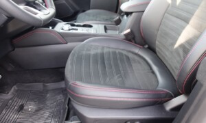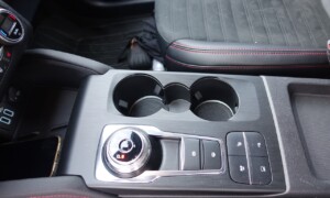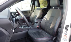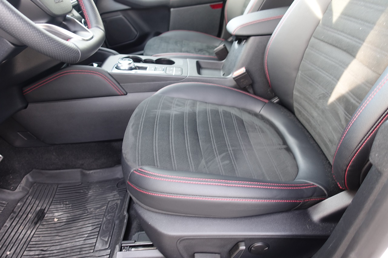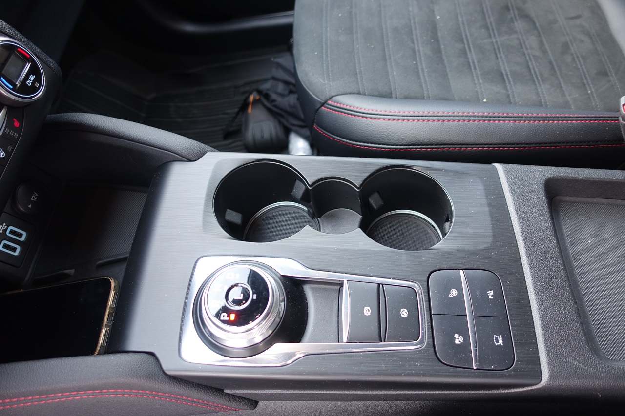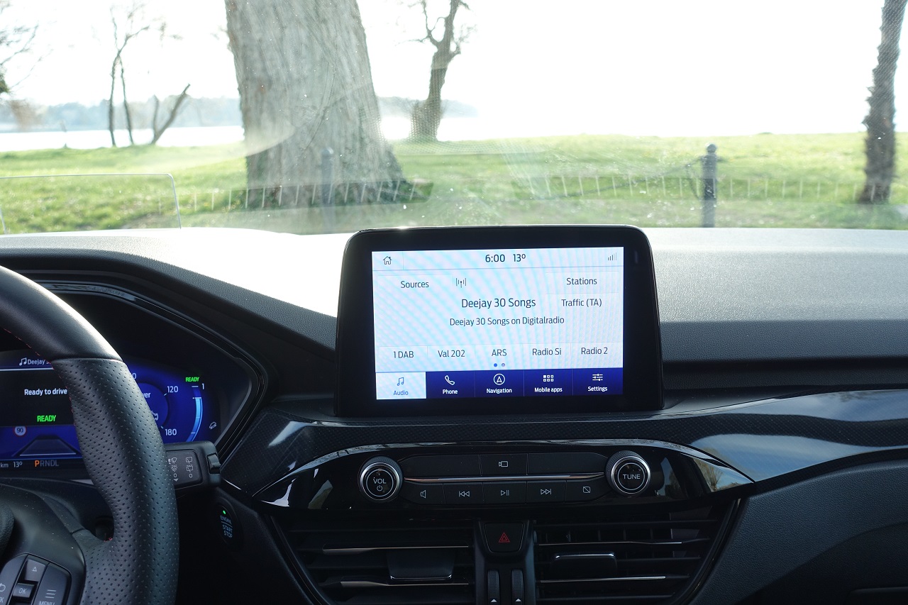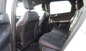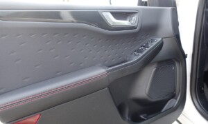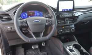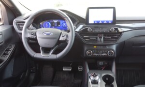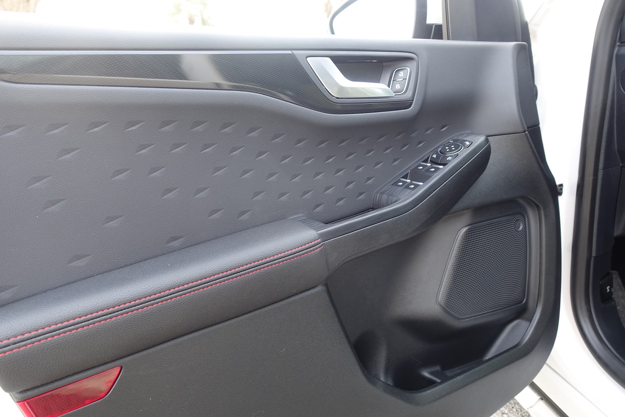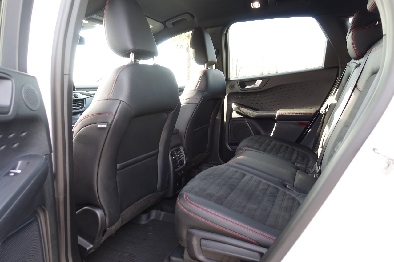 V različici opreme ST-Line z izrazitejšimi odbijači in zadnjim spojlerjem, 18-palčnimi aluminijastimi platišči ter rdečimi šivi na sedežih in vratnih oblogah ustvarja drznejši videz. Malo več športnega duha prispeva unikaten ST-Line volanski obroč z ravnim spodnjim delom ter prednja in zadnja tepiha iz velurja z ST-Line logotipom Kuga. Po prostoru radodarna v notranjosti in v tem primeru tudi v prtljažniku. Litij ionska baterija 1,1 kWh je nameščena pod desnim sedežem. Prtljagi je tako namenjenegado 645 l prostora, kar ni malo celo za družinske potrebe. V notranjost izpostavljamo dober voznikov položaj za volanom, potovalno udobne sedeže iz eko usnja in žameta, prijetnega na otip, udobna zadnja sedeža, obilo informacij na digitalni 12-palčni instrumentni plošči in Head-up displayu na višini voznikovih oči ter na osrednjem 8-palčnem zaslonu na dotik. Povezljivost in nadzor nad telefonom, glasbo in navigacijskim sistemom tudi z glasovnimi ukazi omogoča sistem Ford Sync 3. Barvni zaslon občutljiv na dotik lahko upravljamo s potezami prstov in gibi, gumbi za upravljanje navigacije so nekoliko prenizko za intuitivno navigacijo, ker jemljejo pogled s ceste. SYNC 3 selahko poveže tudi z Apple CarPlay in Android Auto, s AppLinkom pa lahko dostopamo do nekaterih izbranih aplikacij za pametne telefone.