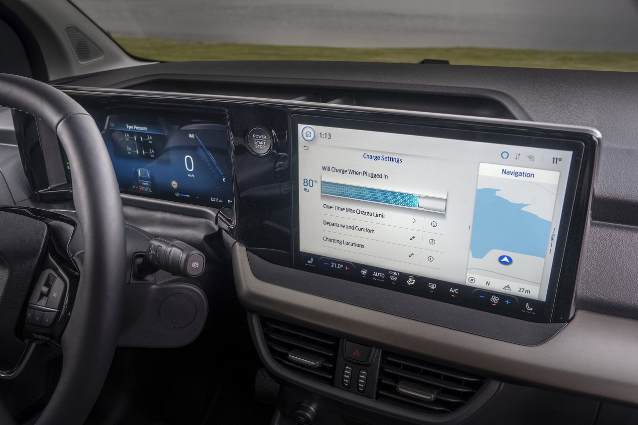 E-Tourneo združuje SUV-elemente z napredno tehnologijo in vsakodnevno praktičnostjo. V notranjosti izstopa kvadratasti volan z ravnim spodnjim delom za večje udobje, vozniški zaslon velikosti 12” in 12” zaslon na dotik s sistemom SYNC 4 omogočata brezžično povezljivost in posodobitve.
