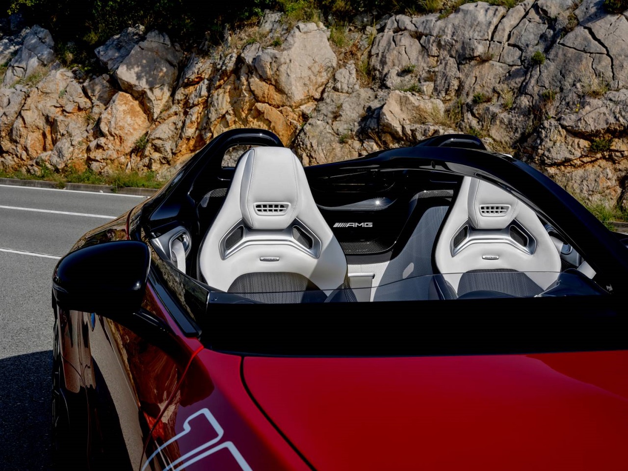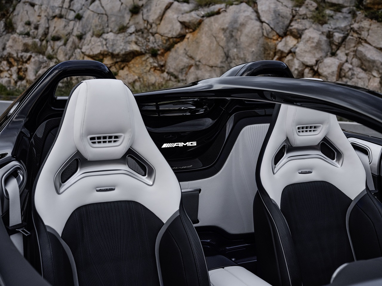Notranjost PureSpeeda združuje luksuz in funkcionalnost. AMG Performance sedeži, izdelani iz ogrevanega karbona, vključujejo sistem Multicontour, medtem ko je na armaturni plošči nameščen prestižni analogni kronograf IWC Schaffhausen v ohišju iz karbona. Kljub povsem odprti strehi avtomobil ponuja napreden avdio sistem Burmester 3D z močjo 1170 vatov.