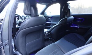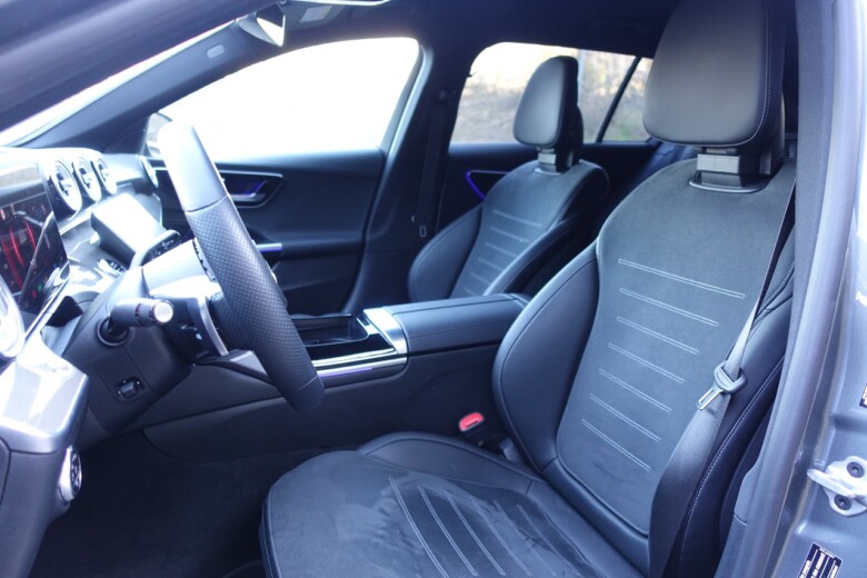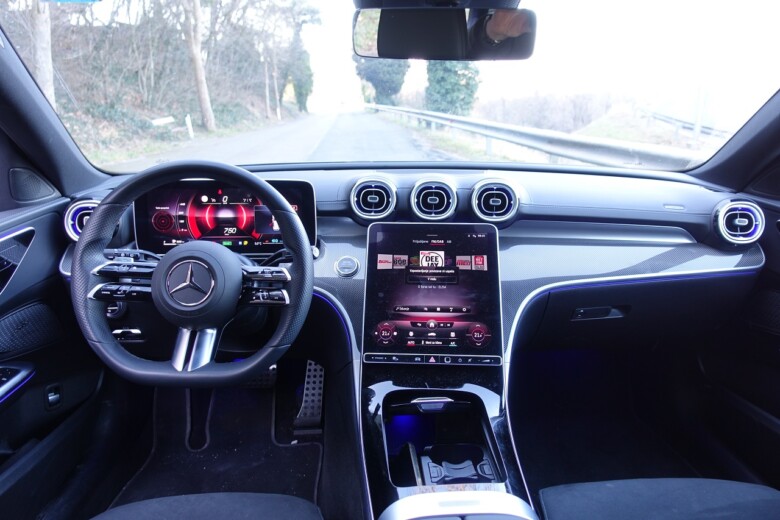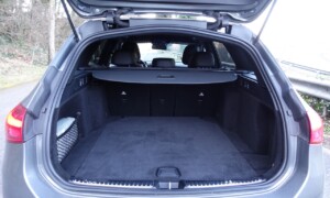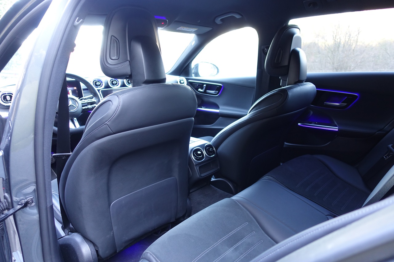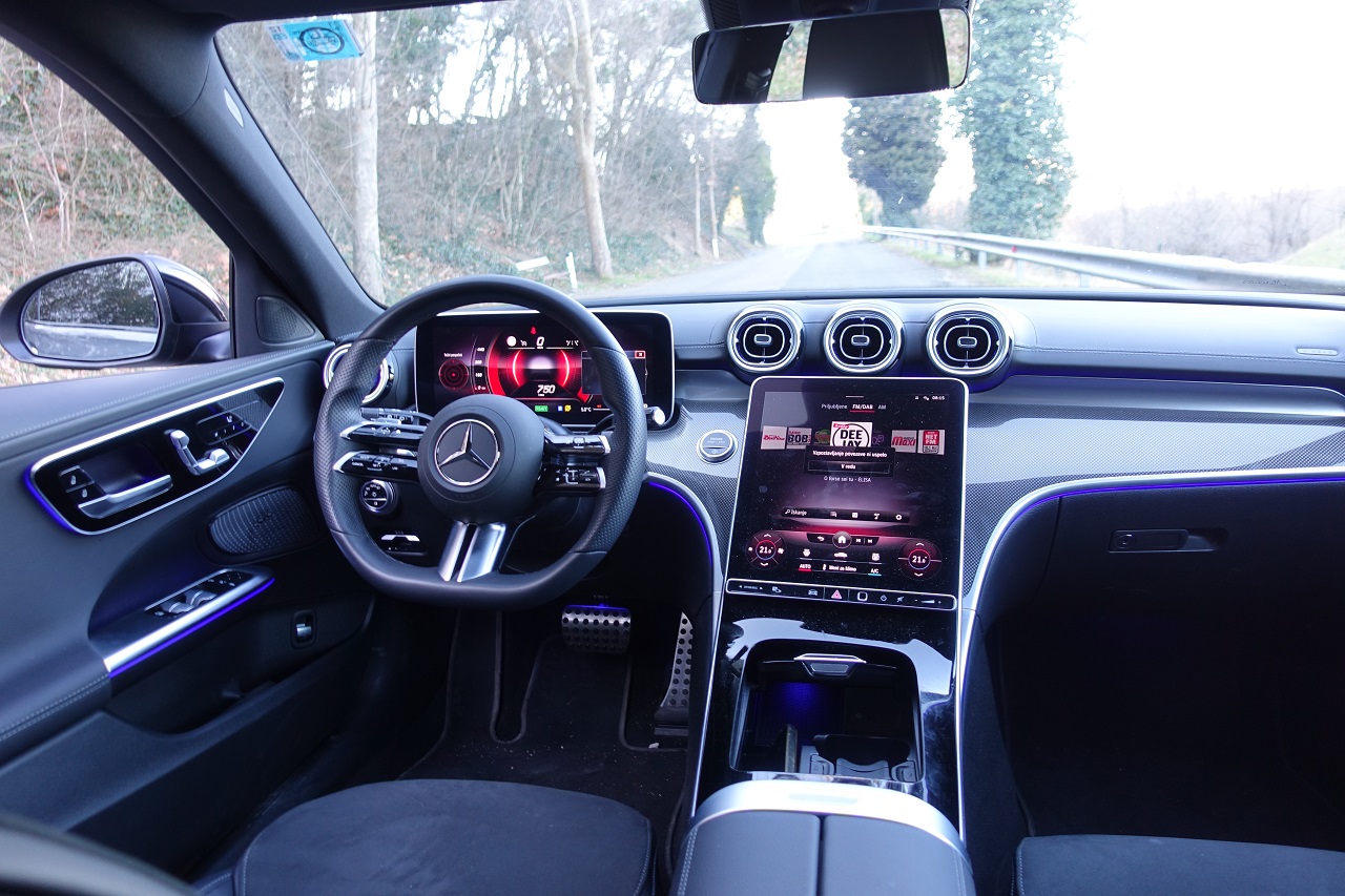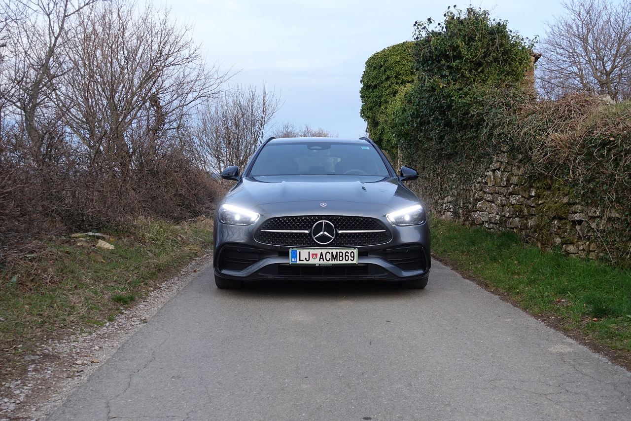 Med številnimi tehnološkimi rešitvami so mogoče tipke na volanu najmanj prepričljive, ker se ne odzivajo vedno natančno tako kot bi želeli in jemljejo pozornost voznika s ceste, ko želi preveriti. In, če gre za družinski avtomobil, bi si želeli USB vtičnice tudi zadaj. Sicer pa karavan z dolžino 4,75 m in širino 1,82 m ter medosno razdaljo 2,865 m, ni bil nikoli večji kot zdaj, čemur so hvaležni tisti, ki sedijo zadaj. Če niso višji od 1,90 m imajo dovolj prostora nad glavo in za kolena, kar pa ne velja za tretjega v sredini, ki bo zaradi širokega sredinskega grebena pristal, da ga peljemo le, če ne bo imel druge izbire. Dostop do zadnjih sedežev se proti zadnjemu delu nekoliko zniža. Kriv je novi, elegantno zaobljen športni zadek z dvodelno zadnjo lučjo, ki se podreja oblikovnemu in aerodinamičnemu učinku. Serijsko vgrajen v novi karavan razreda C je pokrov prtljažnika EASY-PACK, ki se ob pritisku na gumb samodejno odpre in zapre, kar pride ob nizkem spodnjem robu še kako prav pri večjem natovarjanju in raztovarjanju. Prtljažnik je v osnovi za 30 l večji, oblečen v kakovostno blago. Pogrešamo mogoče elastične trakove za pripenjanje stvari v njem in mogoče še 30 V vtičnico za vsak slučaj.