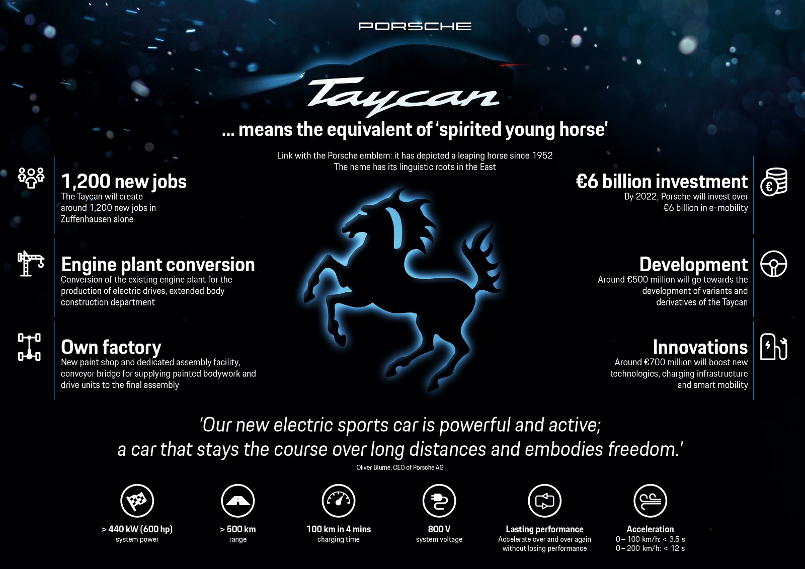 Električna prihodnost je z novim popolnoma električnim modelom korak bližje. Serijska proizvodnja se začenja prihodnje leto. Misija E se zdaj uradno imenuje Taycan. Ime izhaja iz orientalske tradicije, kar v grobem pomeni »živahen mlad konj«, nanaša pa se na obdobje po letu 1952 s prispodobo ‘konja v galopu na Porschejeven grebenu.