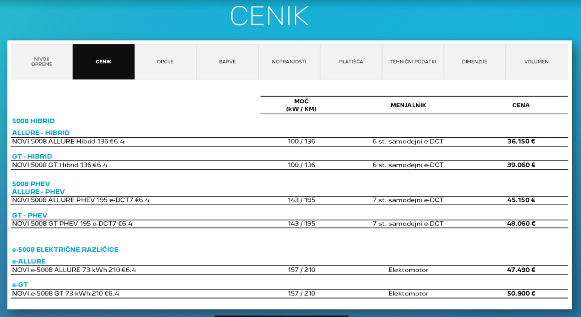 Peugeot 5008 vključuje vrhunske varnostne funkcije, ki zagotavljajo varno in udobno vožnjo. Samodejna prilagoditev svetlobnega snopa poskrbi za optimalno osvetlitev cestišča brez zaslepljevanja drugih udeležencev v prometu, medtem ko izboljšani varnostni sistemi skrbijo za zanesljivo in brezskrbno vožnjo. Vstopna različica 5008 ALLURE hibrid 100 kW/136 KM s 6-stopenjskim samodejnim menjalnikom e-DCT je 36.150 evrov.
