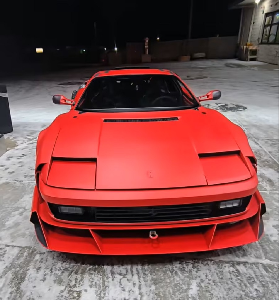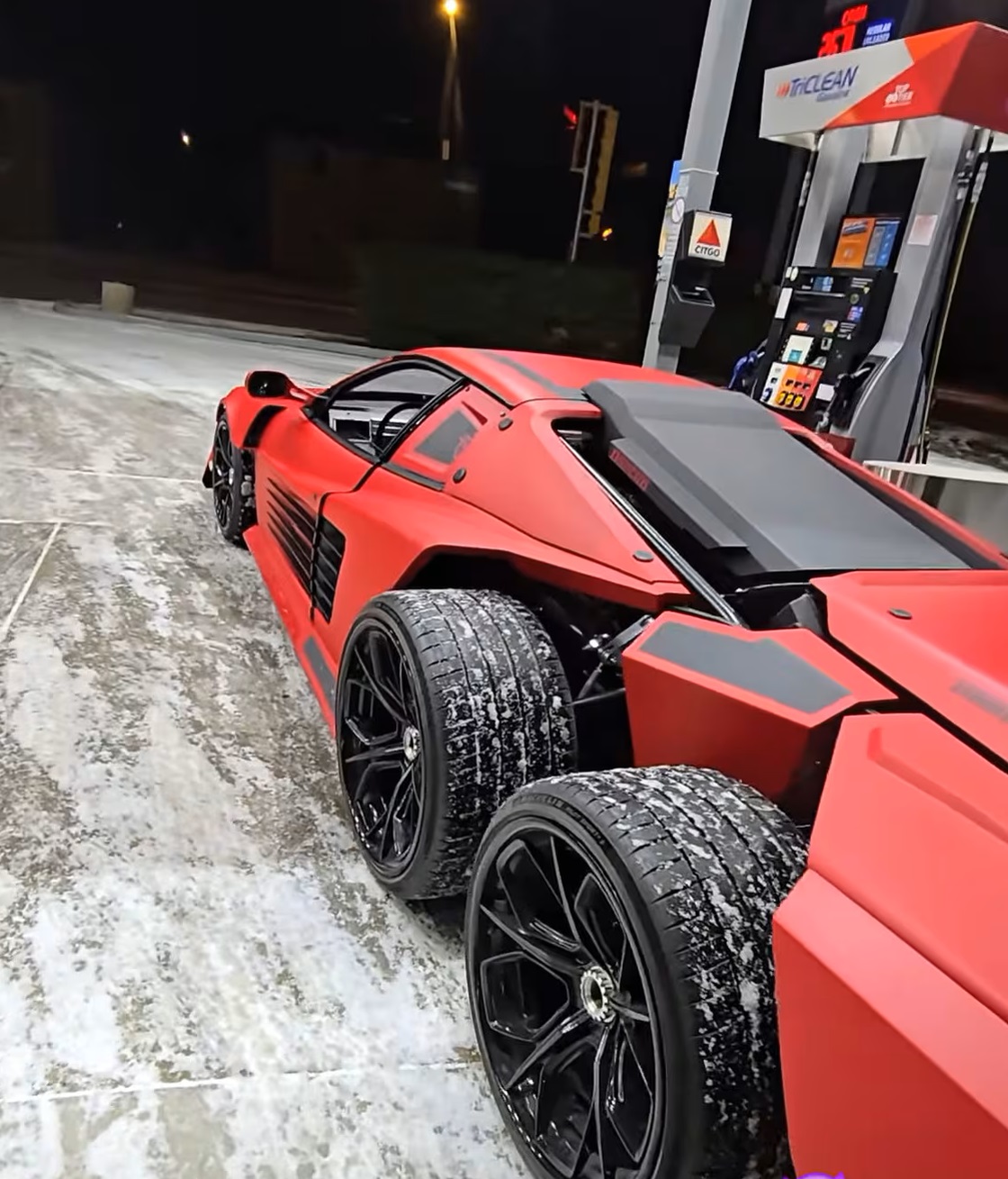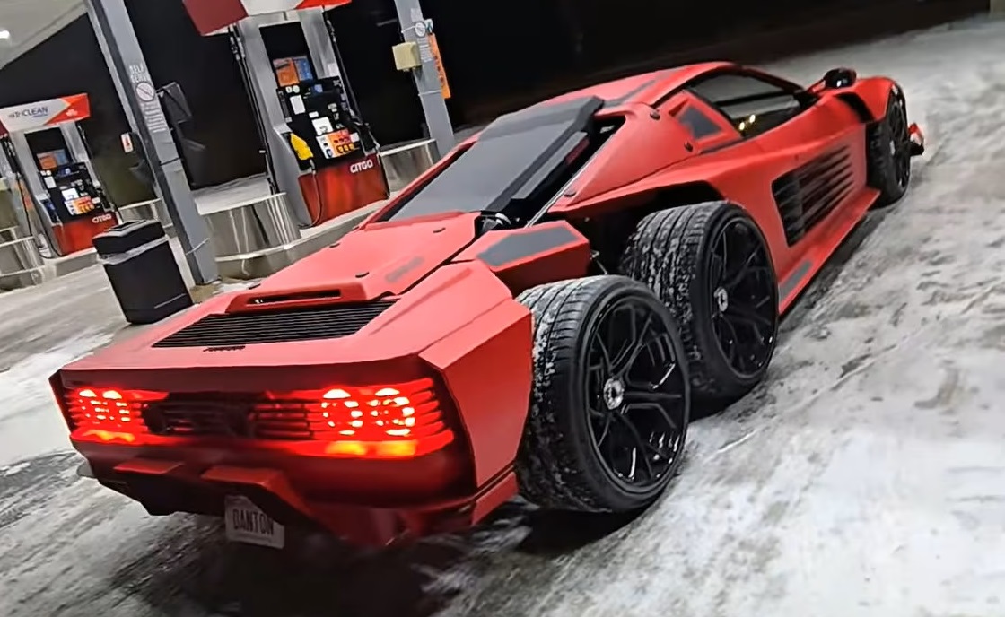 Testarossa v Dantonovi interpretaciji ni več le klasičen Ferrari – postala je brutalno agresivna in futuristična umetnina na štirih… oziroma šestih kolesih. Karoserija je doživela popolno preobrazbo: razširjeni blatniki, spremenjen prednji odbijač in dodatne odprtine za zrak ji dajejo še bolj napadalno držo. Izskočni žarometi, značilni za prvotni model, so zamenjani z aerodinamičnimi pokrovi, ki poudarjajo ostre linije.