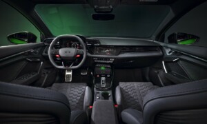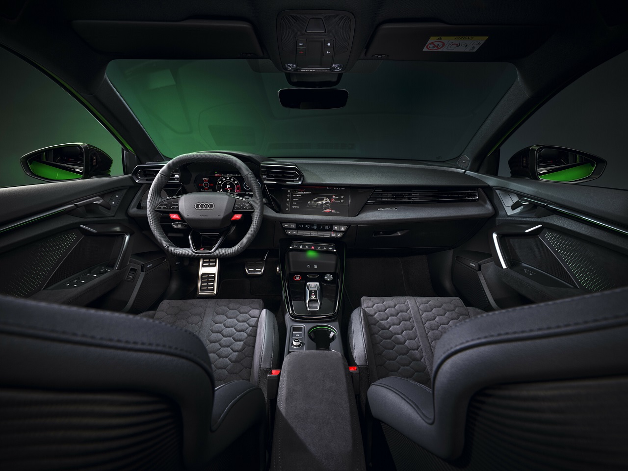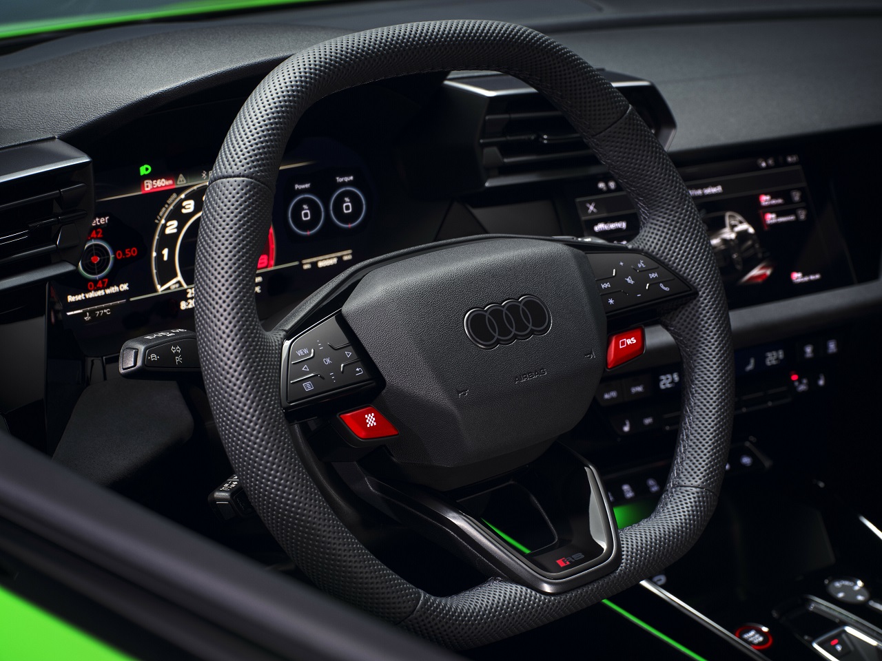 Ob pritisku na gumb za zagon/ustavitev motorja z rdečim obročem se zasliši značilen grlen zvok petvaljnega motorja, ki je še izrazitejši v načinih Audi drive select dynamic, RS Performance in RS Torque Rear. Poleg tega je bil nadzor izpušne lopute optimiziran v območju med 2.200 in 3.500 vrtljaji, kar zagotavlja enakomerno in bolj polno zvočno kuliso ne glede na izbrani način vožnje. Audi Sport tako povečuje čustveno doživetje vožnje v tem vrhunskem modelu družine A3, še posebej v kombinaciji z opcijskim izpušnim sistemom RS Sport.