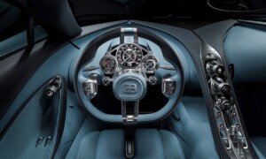 Pogled v notranjost kokpita v trenutku pove, zakaj je Bugatti za ta model izbral ime Tourbillon. Zdi se, kot bi bil sofisticiran mehanizem visokega urarstva izbran za izdelavo armaturne plošče, sestavljene iz 600 delov, z zobniki iz titana in rubini. Vse je nastalo v sodelovanju s švicarskim urarjem. Čeprav je analogen, kot vsi instrumenti, sestavljeni iz gumbov in gumbov, lahko posreduje večno lepoto, ki kristalizira čas. Delo zaključita še usnjena notranjost in izvlečni zaslon, ki iz armaturne plošče izstopi le na voznikovo željo.