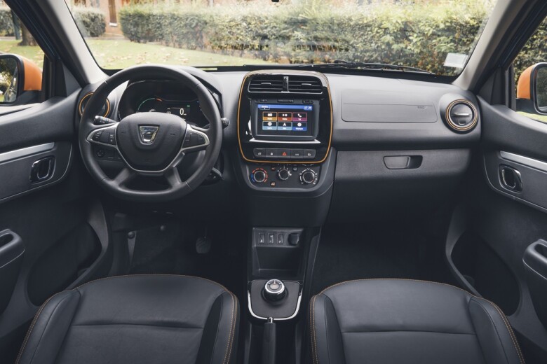 Spring Electric je prepoznavem po oranžnem, barvnem paketu. Ta vsebuje zunanji vzvratni ogledali, okrasni del strešnih nosilcev, obrobe bočnih oblog in zračnih rež spredaj oranžne barve. Zadnji luči imata nov svetlobni pečat znamke Dacia iz svetilnih diod v obliki črke Y. Notranjost poudarjajo oranžni okrasni šivi na sedežih, obrobe zračnikov in multimedijskega zaslona, obloge vrat pa so svetlo sive barve. Dacia zatrjuje, da ima prtljažnik največjo uporabno prostornino v tem razredu: 270 dm3 po VDA ne upoštevajoč prostor pod podom, ki je namenjen rezervnemu kolesu ob doplačilu, oziroma 290 litrov, kar bi že bilo na ravni višjega razreda. Uporabna prostornina lahko do vrha sedežev naraste do 620 litrov.
