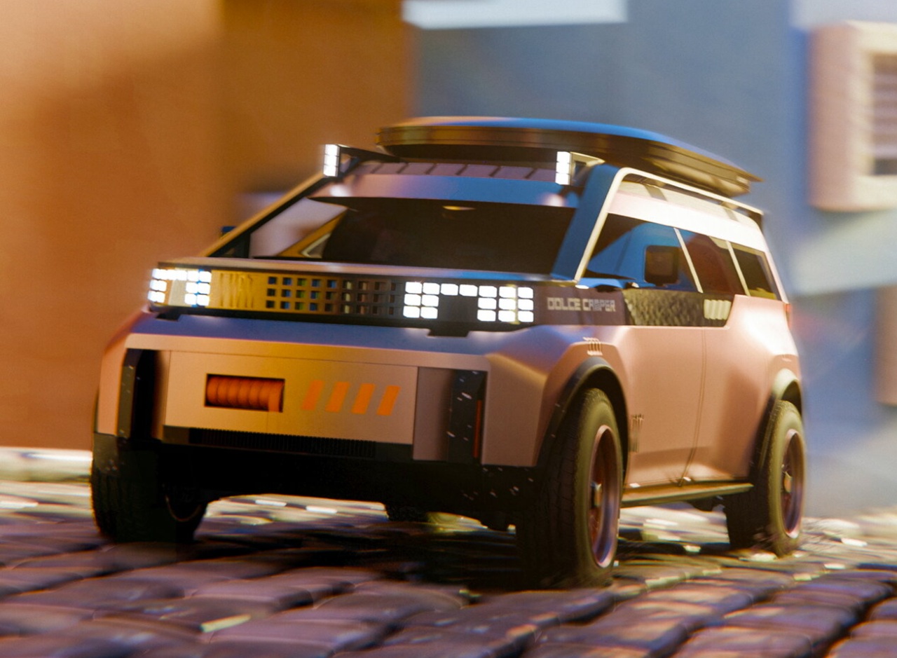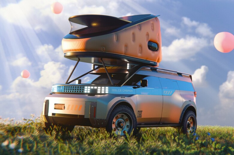 Koncept Dolce Camper izstopa s škatlastimi in izrazitimi proporci, ki sledijo trendu robustnega urbanega oblikovanja. Posebno pozornost pritegnejo žarometi s pikselno strukturo, ki vozilu dajejo prepoznavno in samozavestno podobo. Široki, izbočeni blatniki dodatno poudarijo terenski značaj in vizualno moč celotnega vozila.