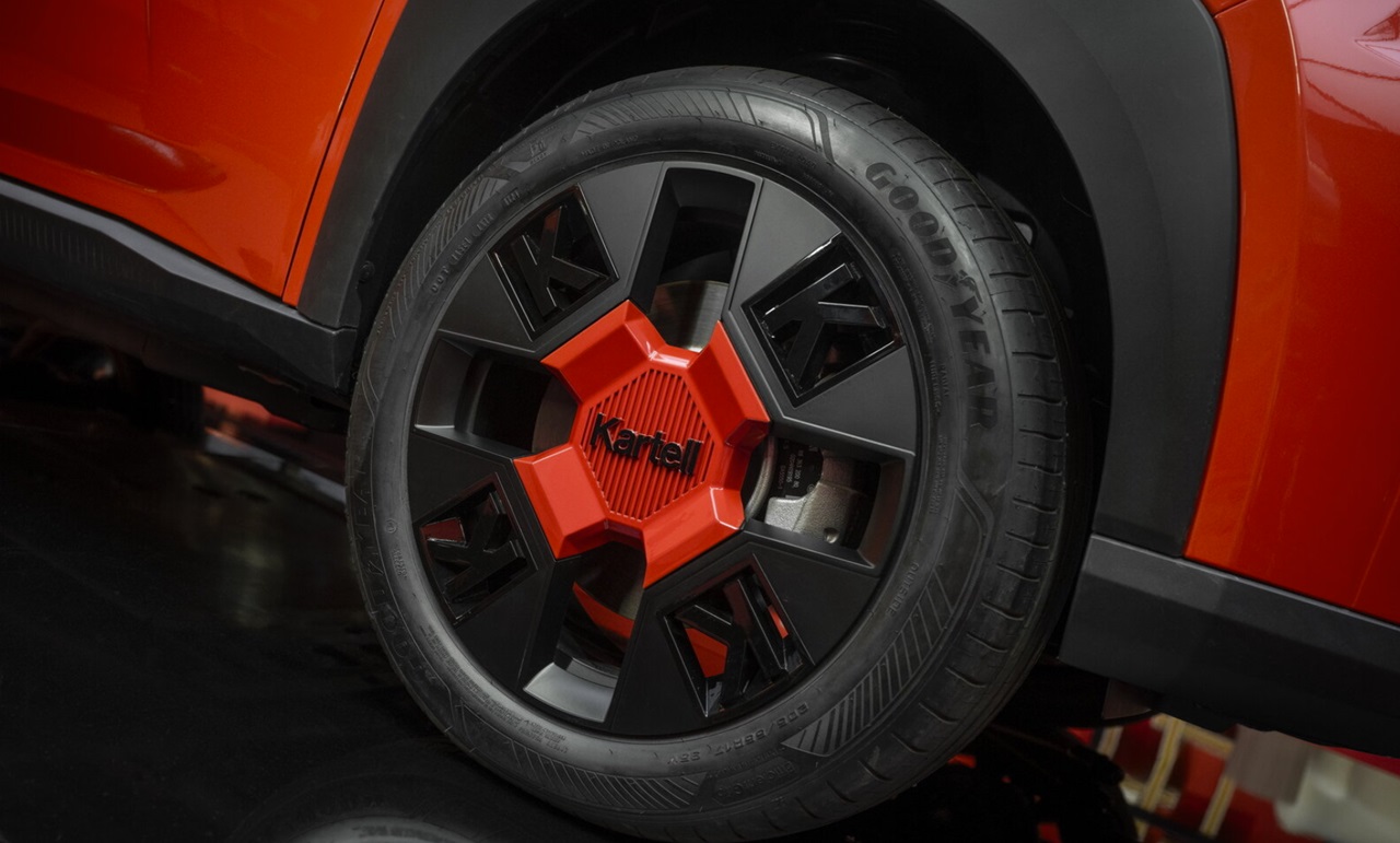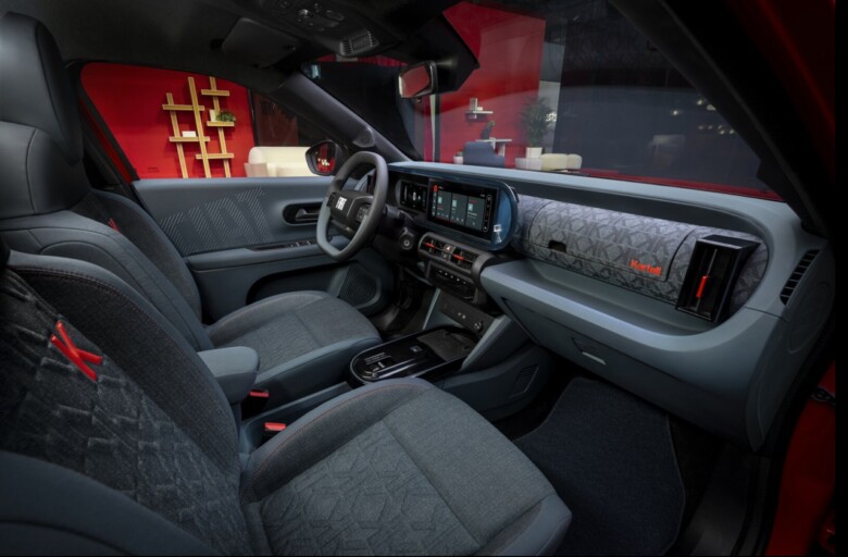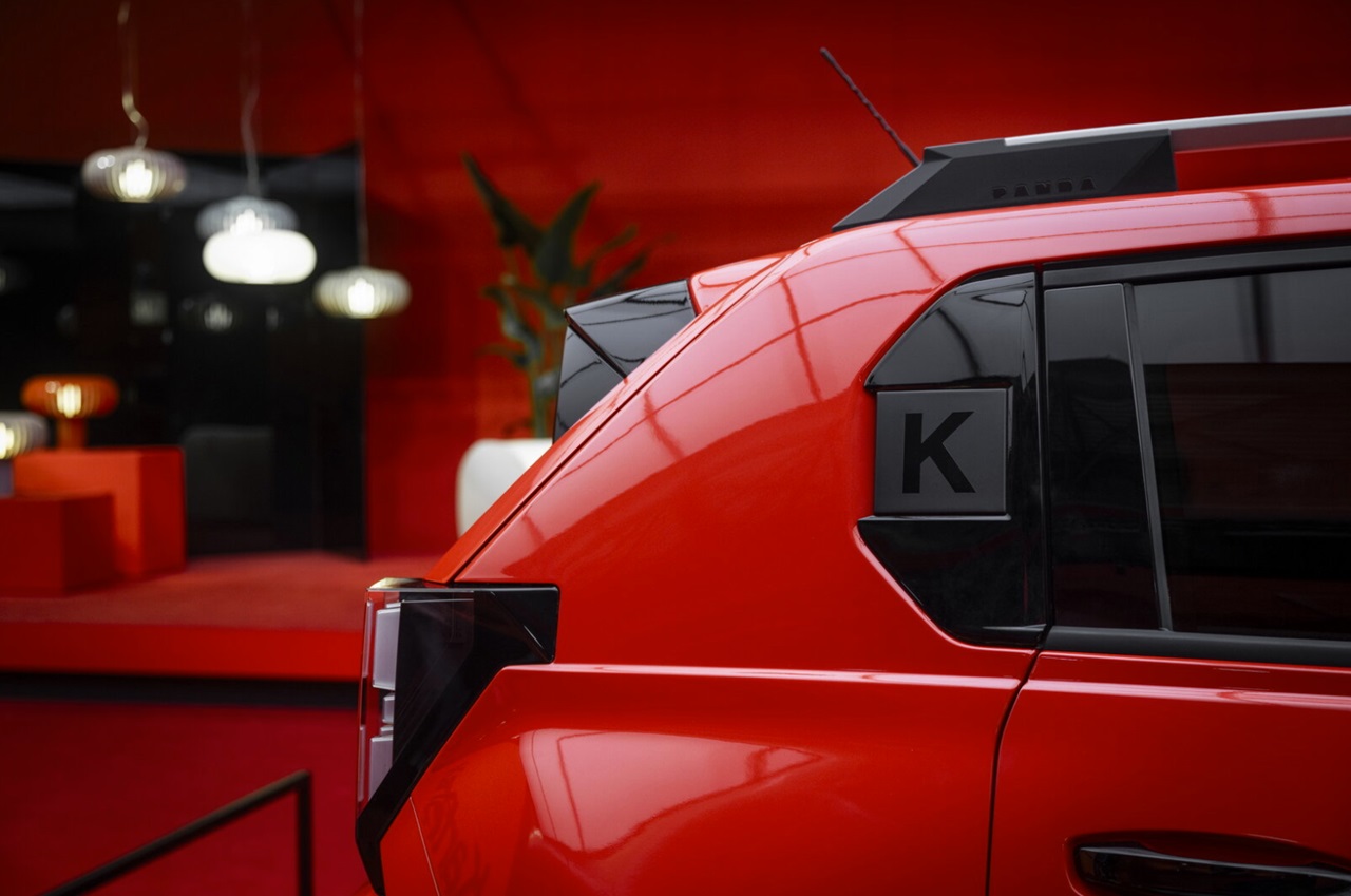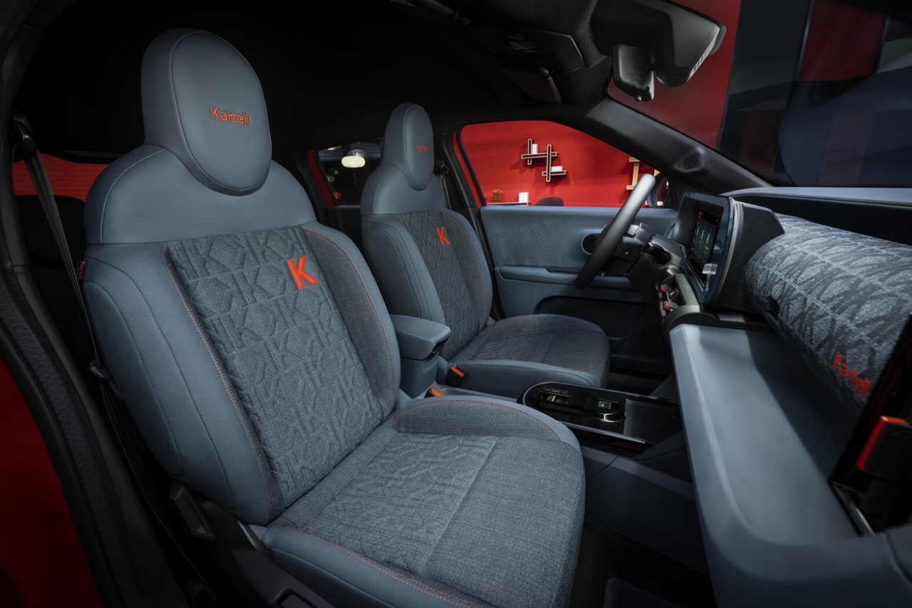 Konceptna Panda je odeta v živahno, energično rdečo barvo, ki jo notranjost v elegantnem Tasmania modrem odtenku lepo dopolnjuje. Kartellov logotip v obliki besede “Love” se pojavlja kot subtilen dekorativni element – na platiščih, zadnjem delu avtomobila in ob stranskih stebričkih. Notranjost deluje igrivo in moderno, z monogramom “KK”, vtisnjenim v vse tkanine, ki so narejene iz naprednih in trajnostnih tekstilov.