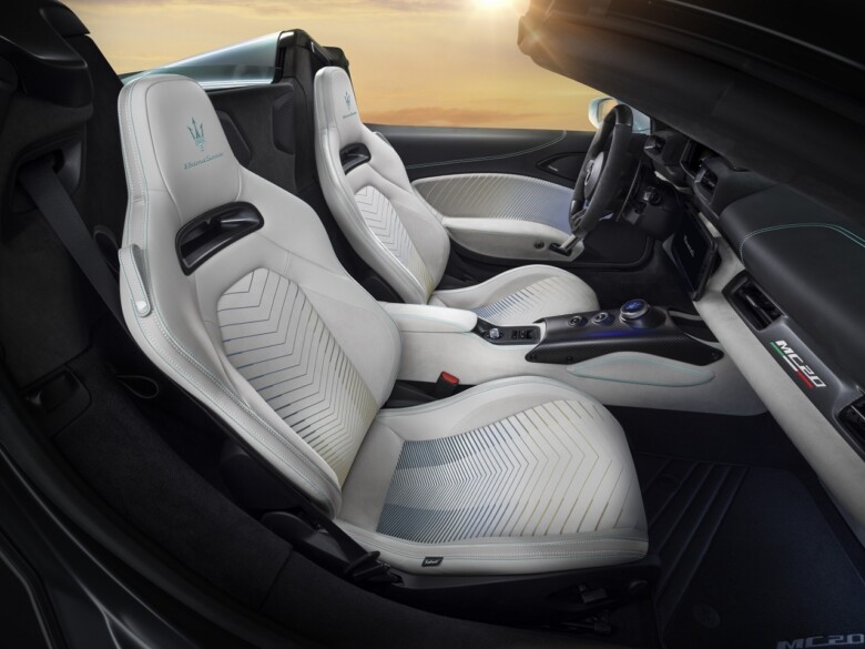 Emblem Trident je naslikan na pokrovu toneau, medtem ko so značke Maserati zaključene v bisernem odtenku mat belega zlata. Ekskluzivni logotip PrimaSerie je všit v barvi Acquamarina na vzglavnikih in lasersko vtisnjen na 20-palčna kolesa, ki pritegnejo poglede v prelivajočem se mat belem zlatu.