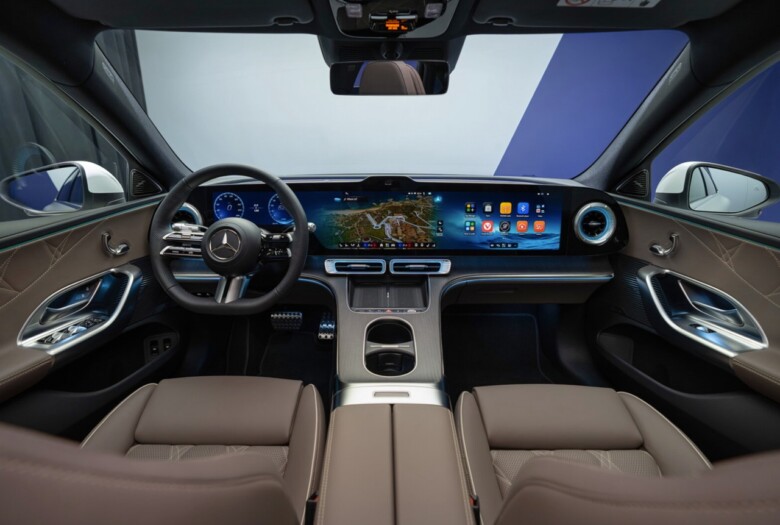 Notranjost prinaša velik preskok v digitalizaciji. Osrednji element je velik zaslon, ki združuje instrumentno ploščo, multimedijo in funkcije za sovoznika. Sistem nadgrajuje znano rešitev MBUX Hyperscreen, vendar v še bolj integrirani obliki.