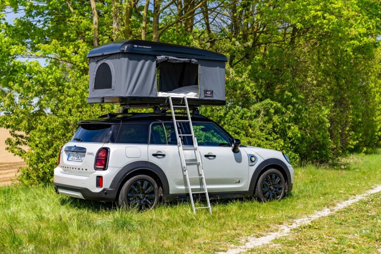 MINI Cooper SE Countryman ALL4 je s hibridno specifičnim pogonom na vsa kolesa in sistemsko močjo 162 kW / 220 KM idealno opremljen za izlete na podeželje. S paketom ALL4 Trim ali Classic Plus dopolnjuje opremo med drugim strešna ograja. Strešni šotor lahko enostavno pritrdite na strešne tirnice z ustreznim nosilcem za ograje.