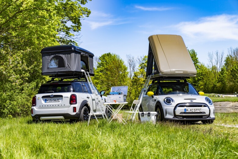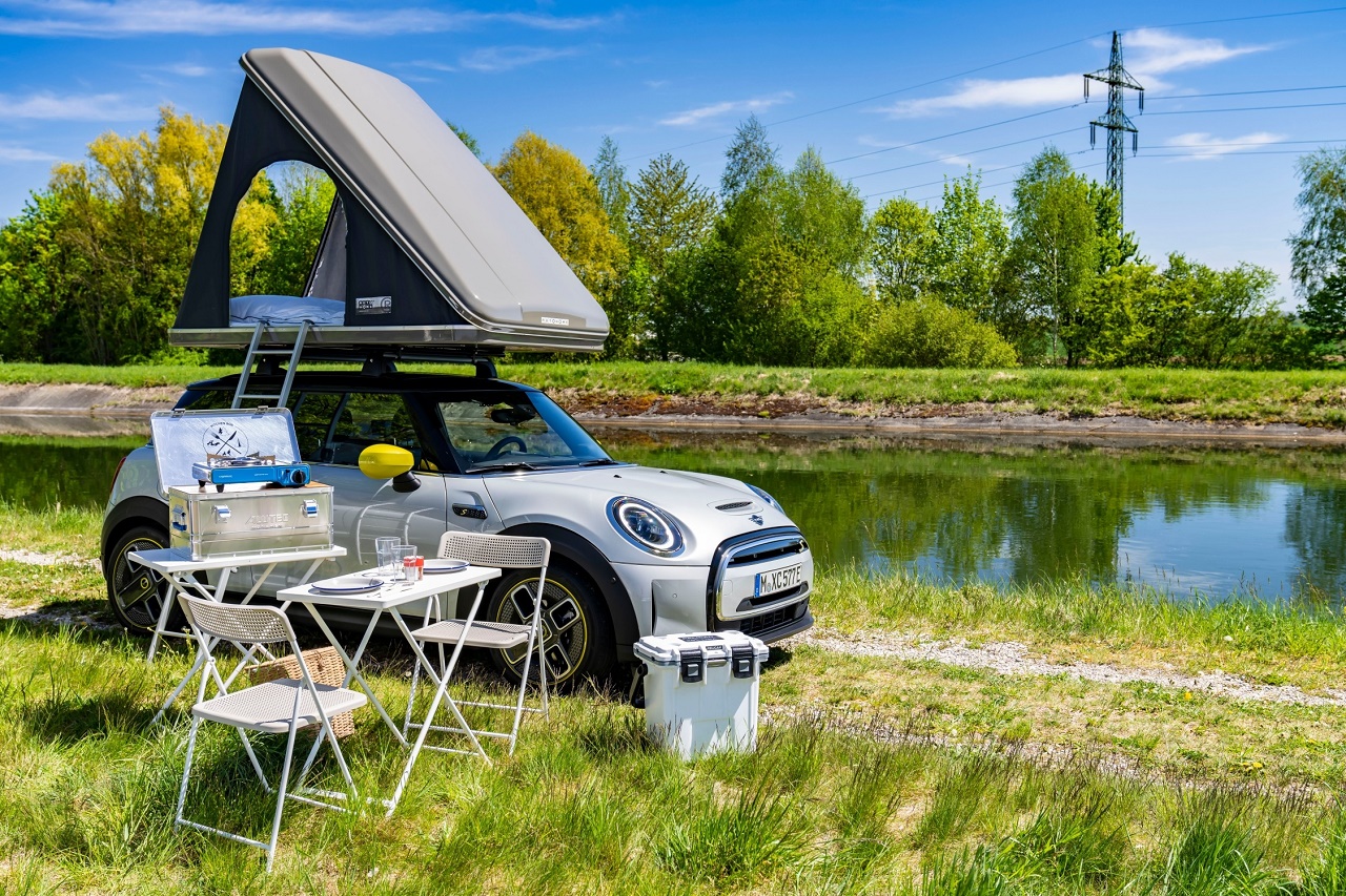 MINI ima na voljo dva modela z elektrificiranim pogonom in ujemajočo se dodatno opremo. Cooper SE Countryman ALL4 s priključnim hibridnim sistemom in popolnoma električno gnani Cooper SE, opremljen v vsakem primeru s sistemom nosilnih sistemov iz ponudbe MINI Original Accessories in strešnim šotorom, v najbolj zeleni floti avtodomov na svetu.