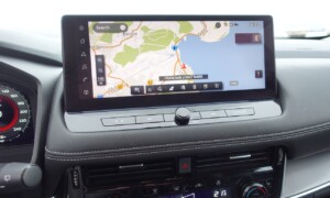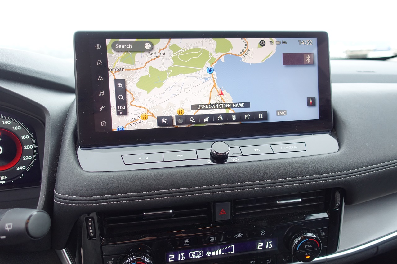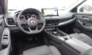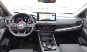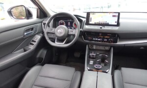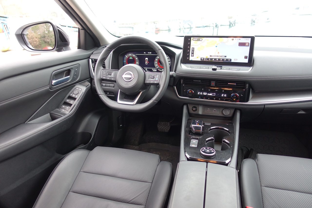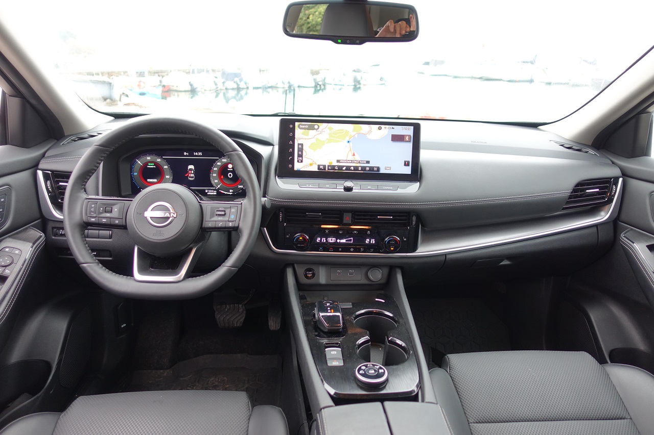 Armaturna plošča je klasično zasnovana, a dobro izdelana, z materiali, kot so eko usnje in temen umetni les. Digitalni zasloni, vključno z 12,3-palčnim merilnikom, projekcijskim zaslonom in zaslonom sistema NissanConnect, ponujajo intuitiven pregled informacij. Ambientna osvetlitev doda sodoben pridih, medtem ko brezžično polnjenje in polavtonomne funkcije vožnje povečujejo praktičnost.