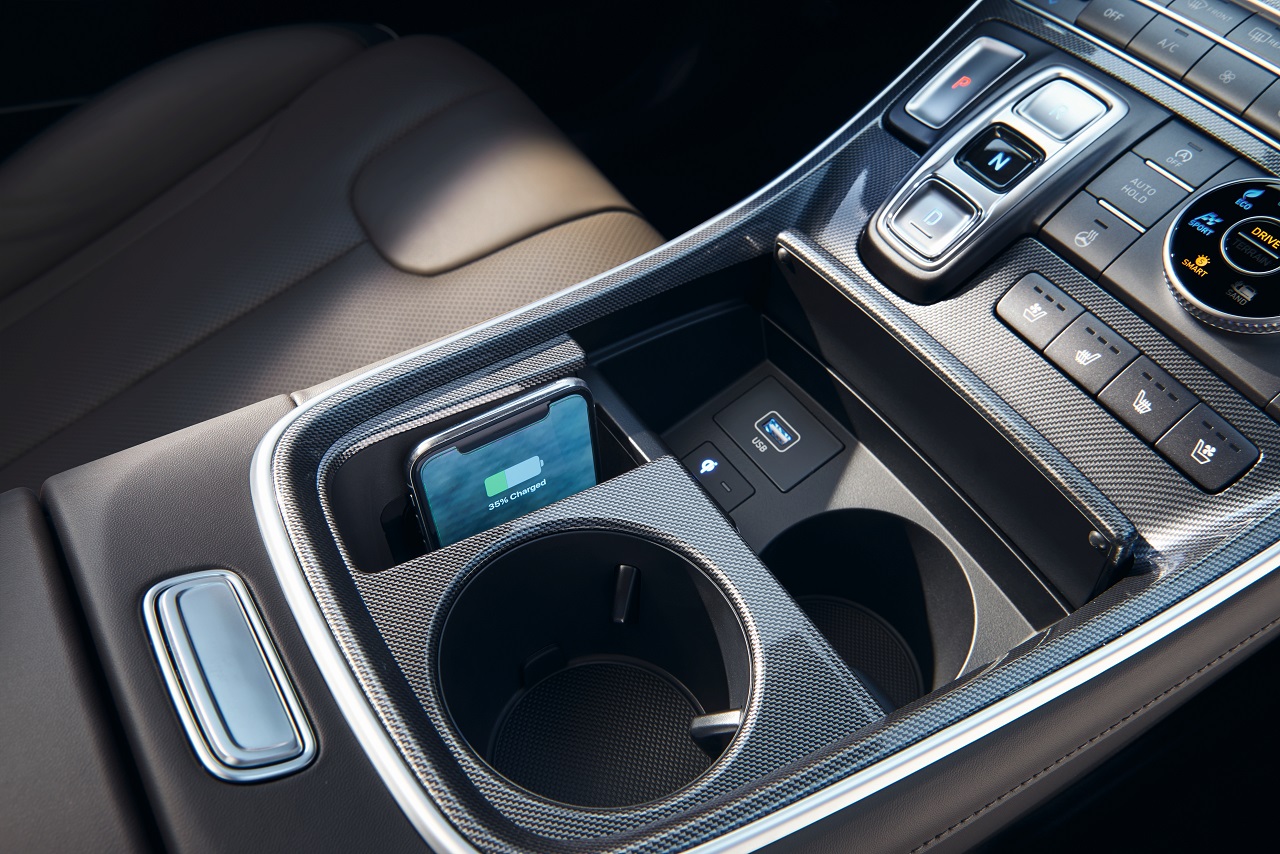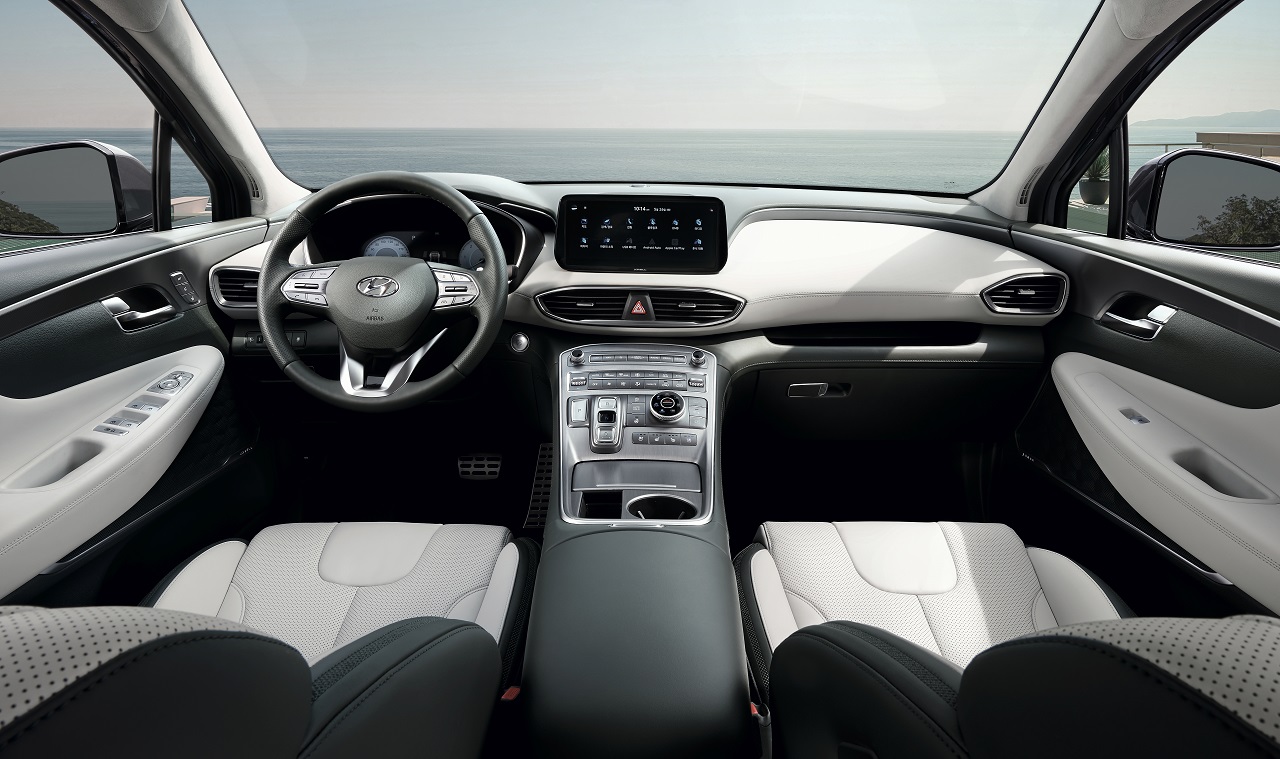 V notranjosti novega Santa Fe´, ki v primerjavi s prejšnjim modelom, obljublja več prestiža, udobja in praktičnega prostora, se predstavlja nova armaturna plošča, postavljena nekoliko nižje, z 10,25-palčnim zaslonom na dotik. Na lebdeči osrednji konzoli so gumbi za upravljanje in samodejni menjalnik, njene poteze pa se elegantno zlivajo z zgornjim delom armaturne plošče. Novost je tudi vrtljivi gumb za izbiro terenskega načina vožnje, ki se nahaja ob izbirniku standardnih voznih načinov.