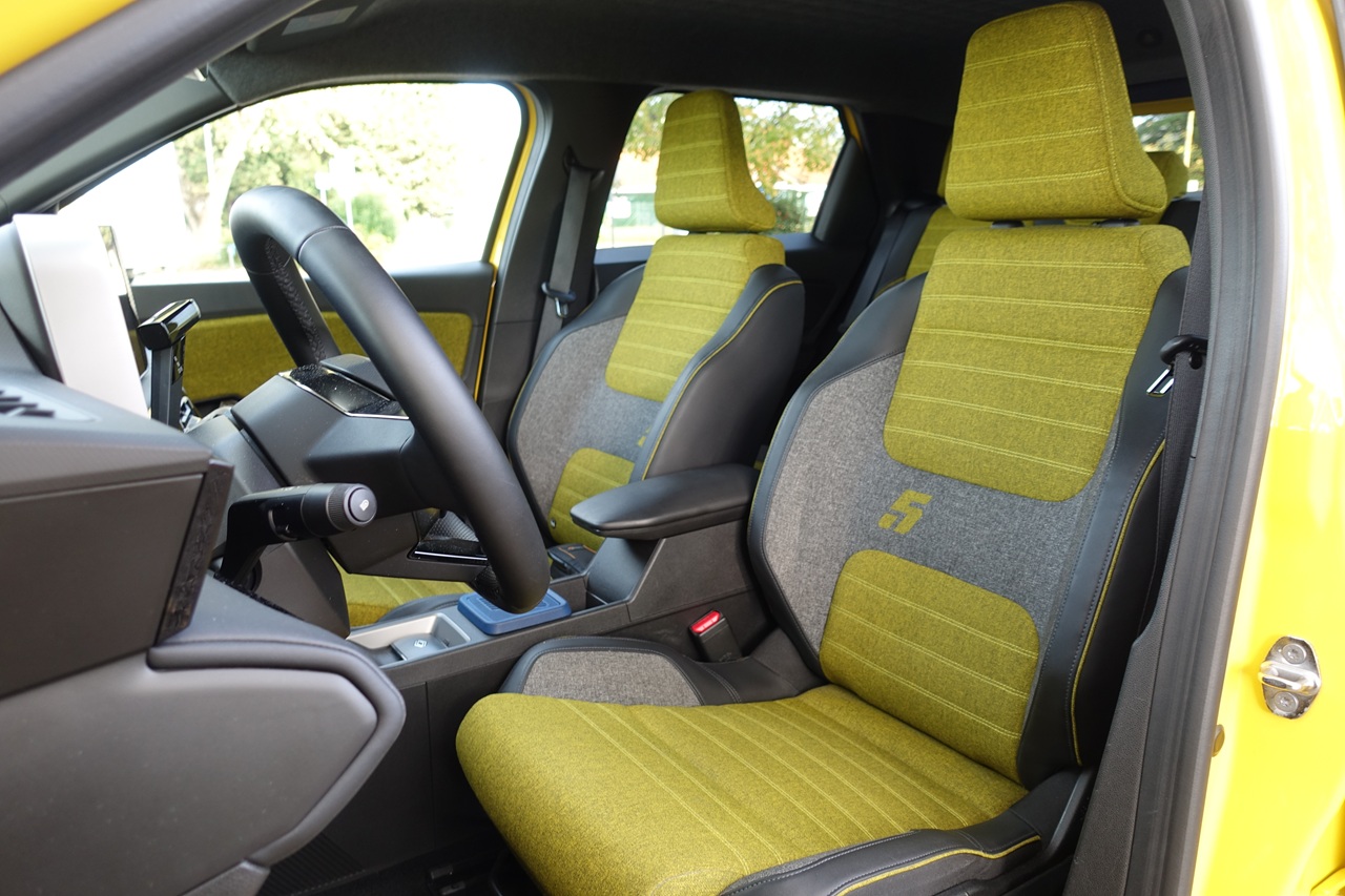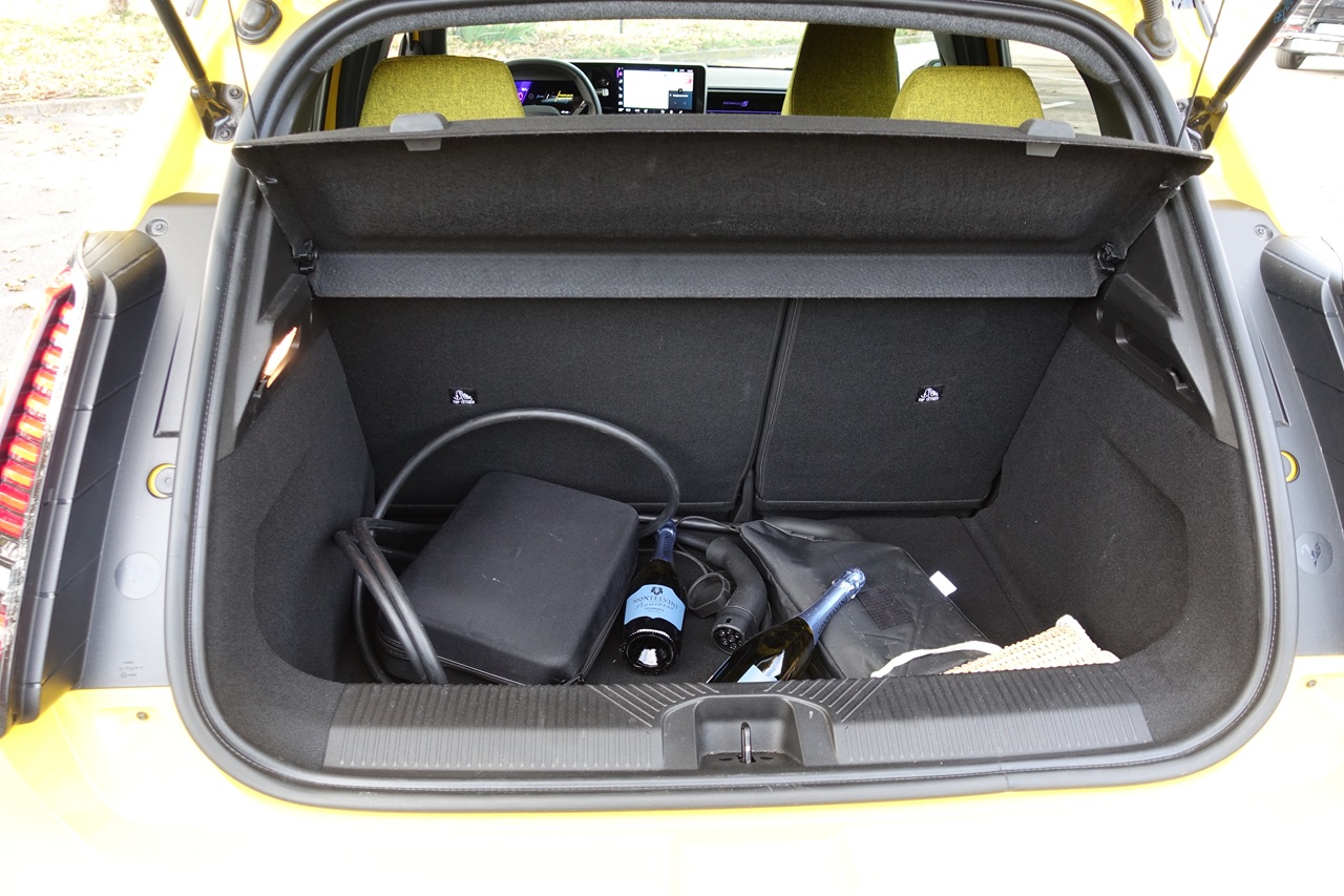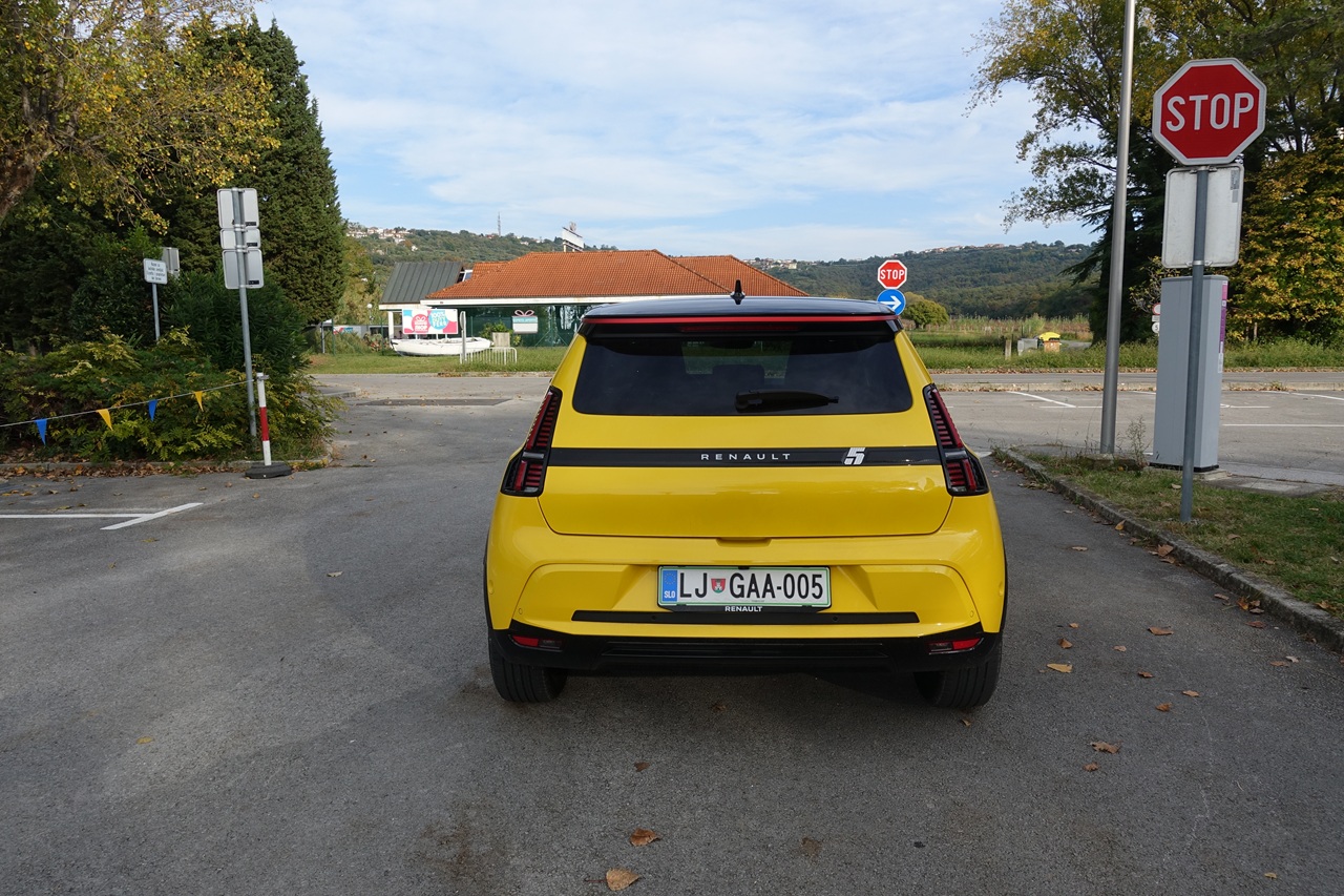 Čeprav gre za mestni avtomobil, je prostora presenetljivo veliko. Renault 5 sprejme pet potnikov, prtljažnik pa meri 326 litrov – torej več kot pri številnih tekmecih. Zadnja klop je sicer primernejša za dva odrasla potnika, a s povsem ravnim dnom omogoča udoben vstop in več prostora za noge. Edina manjša zamera je nekoliko visoka nakladalna robova prtljažnika.