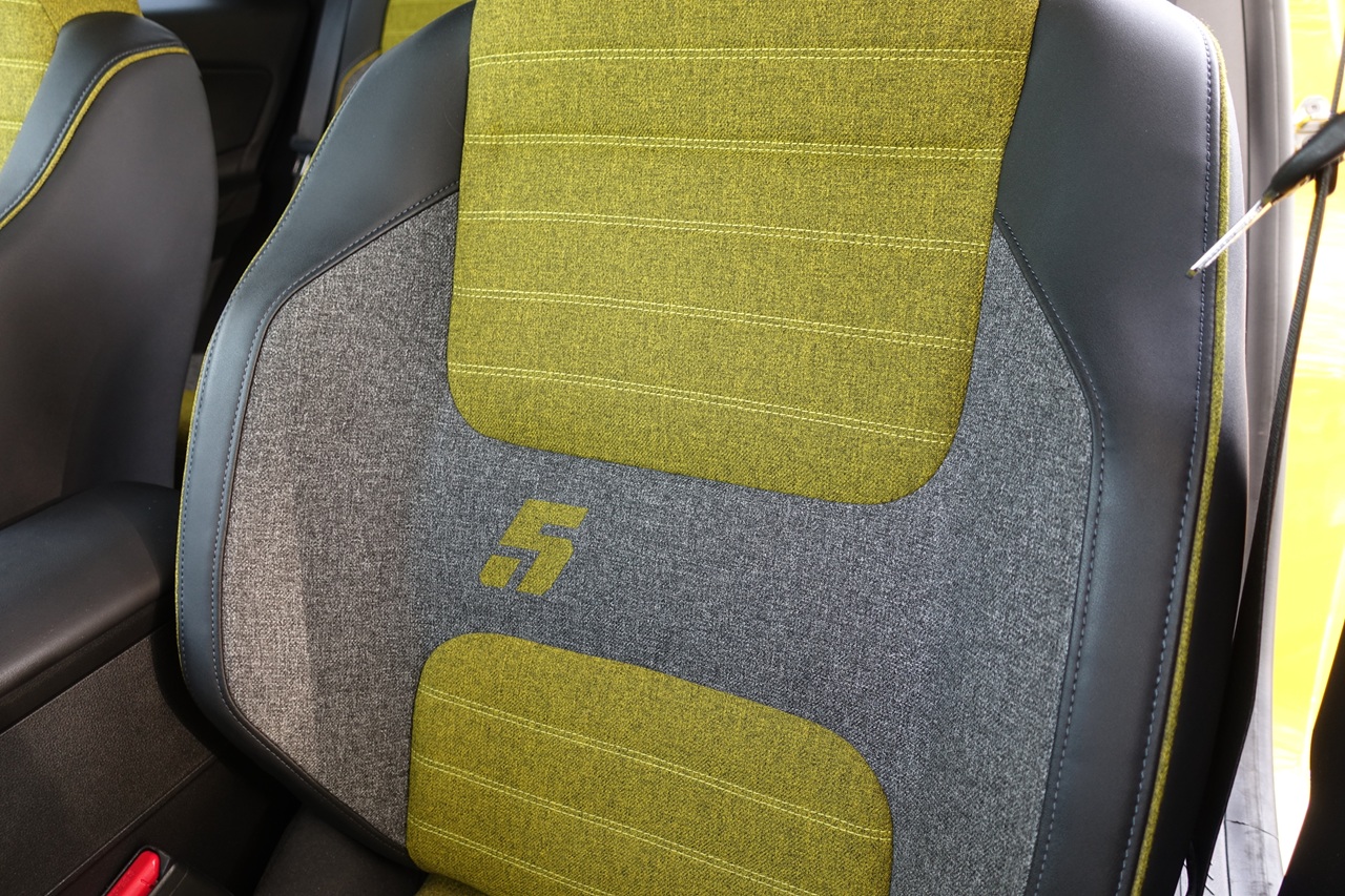 Široki koloteki, kratki previsi in živahne barve dajejo avtomobilu igriv, skoraj športen značaj. Na voljo so 18-palčna platišča, strešna “shark” antena z rdečo obrobo in retro-futuristični sedeži, oblazinjeni z 100 % reciklirano rumeno/sivo tkanino, okrašeno z rumenimi poudarki in značilno oznako “5”.