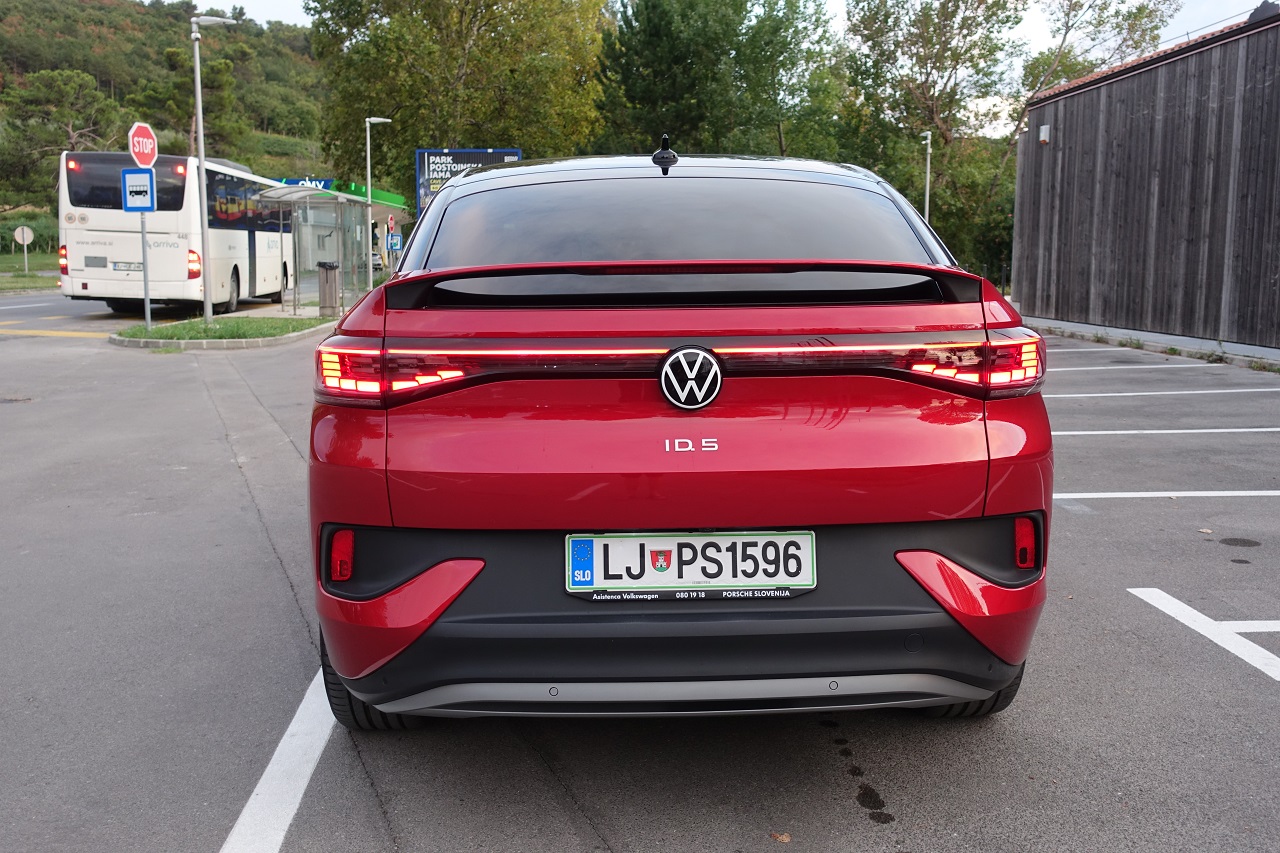 Volkswagen ID.5 deli enako platformo z modelom ID.4, zato se tudi zunanje mere med njima ne razlikujejo prav veliko. Denimo z dolžino 4,60 m le za slaba 2 centimetra. S širino 1,85 in višino 1,61 m ter medosno razdaljo 2,77 m pa je razlika med njima še manjša. Toda ne glede na veliko podobnost med njima in v osnovi prav tako veliko enakost, vključno s pogonskim sklopom, nagovarja ID.5 po okusu drugačne, bolj dinamične kupce. Pri tem stavi predvsem na obliko koncepta SUV-kupe in na idejno povsem nov zadek z izraziteje nagnjenim zadnjim steklom, ki sicer še ne omejuje pogled nazaj in spojlerjem dvignjenim nad bočno linijo vozila, kar oko najprej opazi. LED luči, tako spredaj kot zadaj, povezuje po širini tanka svetlobna linija, s specifičnim svetlobnim podpisom. Na zadku seveda ni izpušnih cevi.
